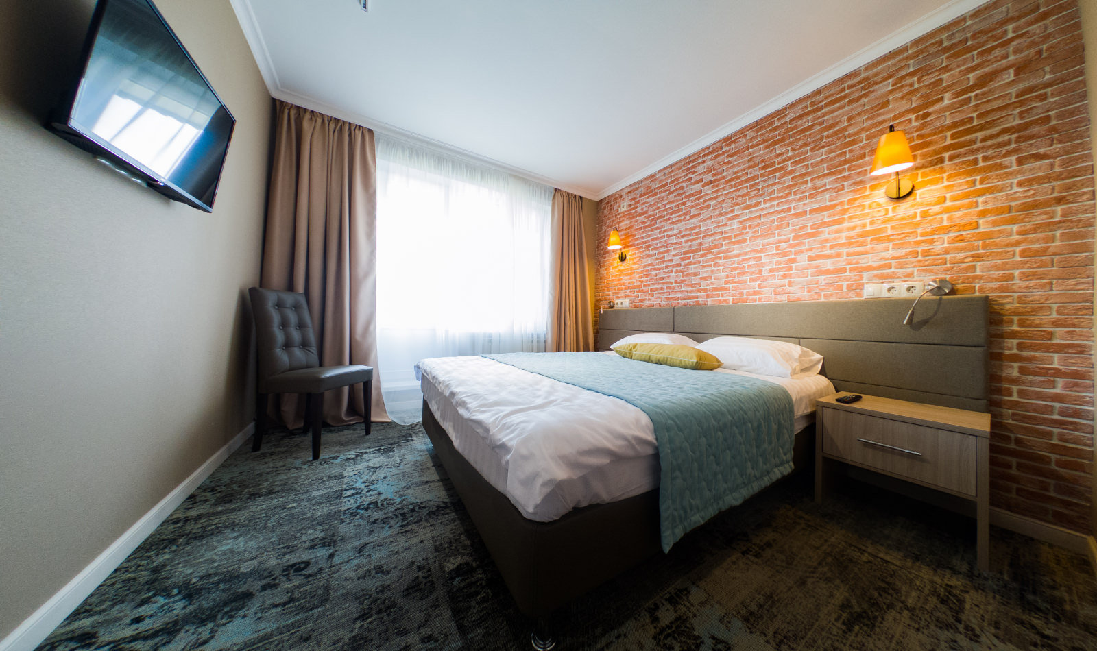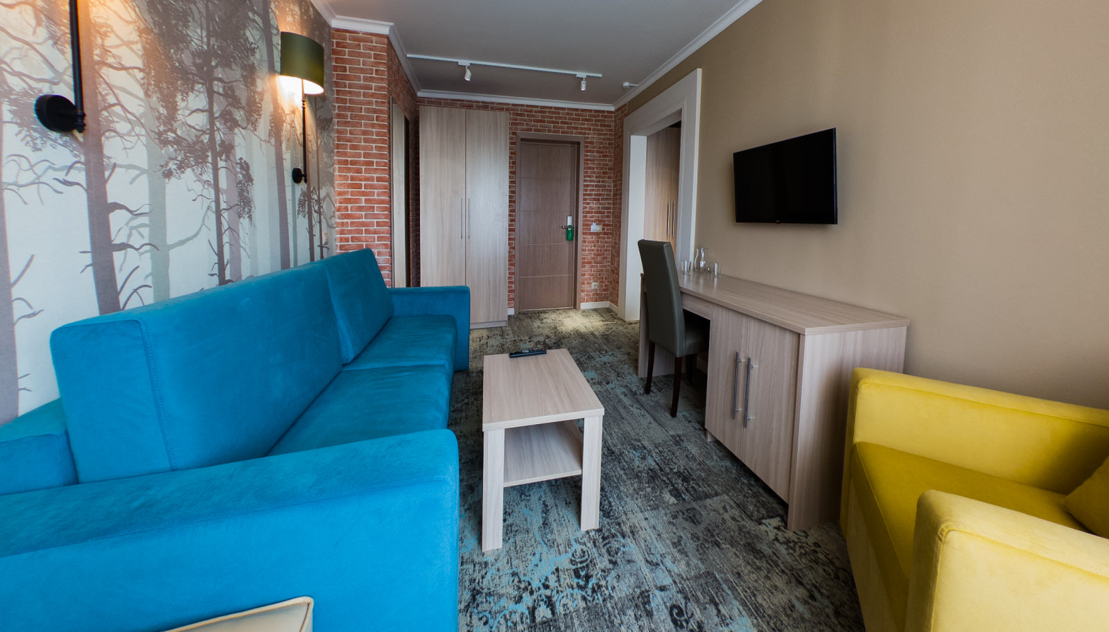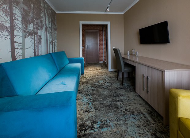 Площадь номера - 30 кв.м. 2 осн. места. 2 доп. места. Мебель: кресло, кровати односпальные /одна двуспальная кровать, прикроватные тумбочки, стол (письменный), столик журнальный, стулья, шкаф. Оборудование: телевизор, холодильник. Санузел: с душевой кабиной, тапочки, туалетные принадлежности, фен, халат. Сервис: Wi-Fi бесплатно, смена полотенец, смена постельного белья, уборка номера.